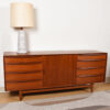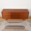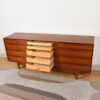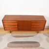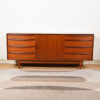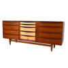 This gorgeous dresser is as functional and as beautiful now as it was when it was designed by Svend Madsen fifty+ years ago. It features drawers galore — four on either either, and another five hidden behind the central tambour door.