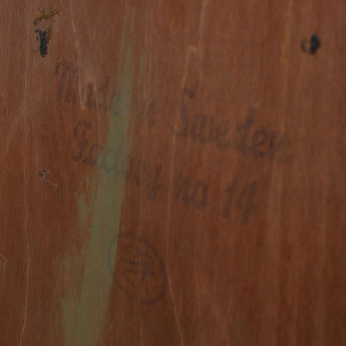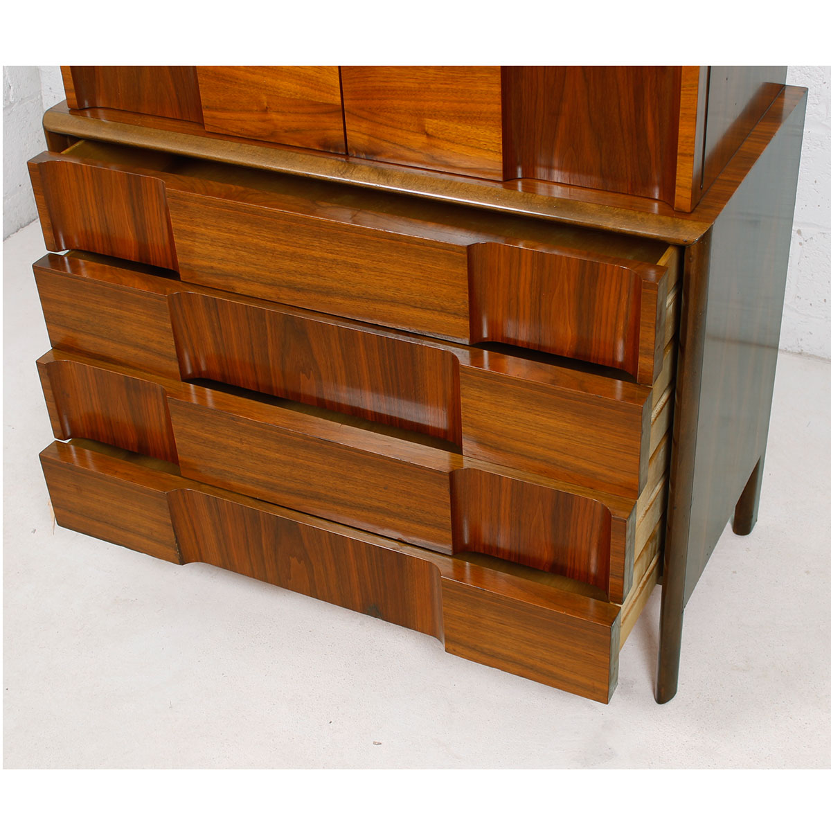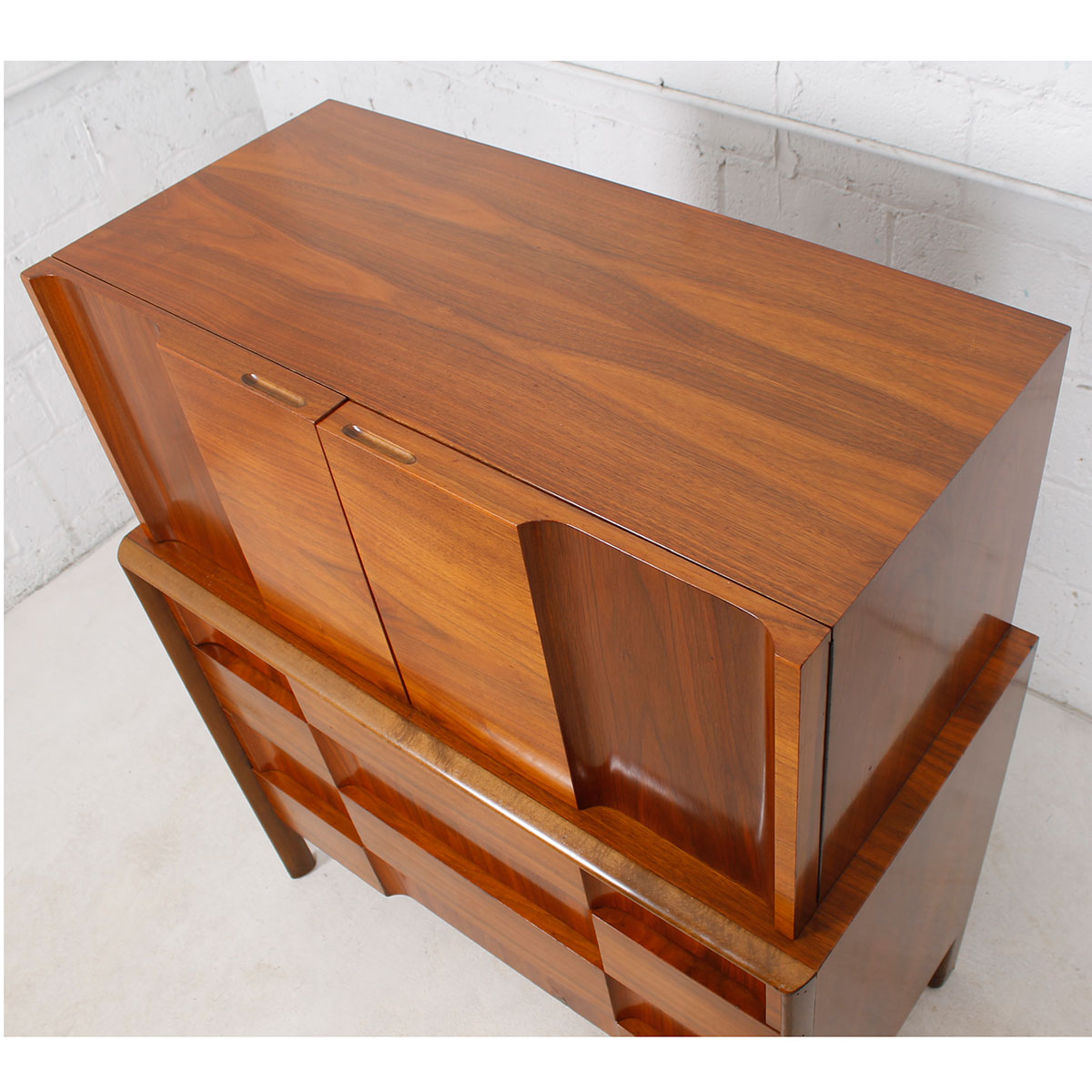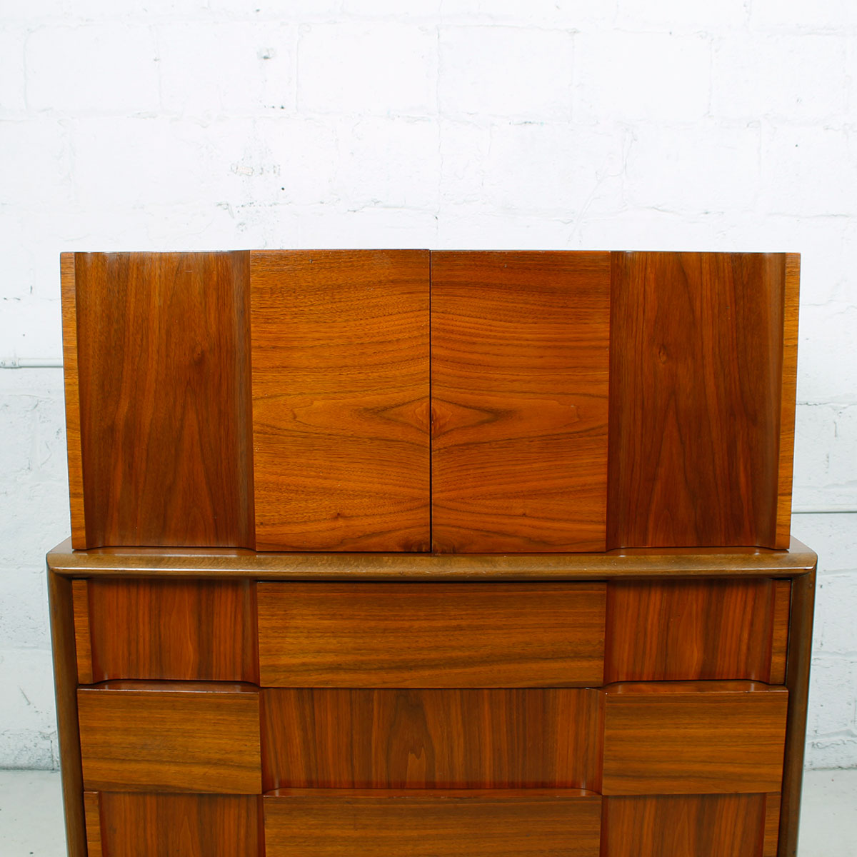 Stunning…jaw-dropping…these are just two words that come to mind when looking at this Swedish Mid century modern dresser. Given its internal structure and external beauty it could come right out of the bedroom and fit into the living room as a bar cabinet. The piece has two elements – the top with its two doors cubby area behind. The bottom, slightly larger, has four drawers. The entire front has alternating panels of horizontally and vertically oriented walnut veneer. The middle of the doors has been particularly placed to create a dramatic focal point. Throughout, the wood grain gleams in interplays of light and dark. Functional and stunning.