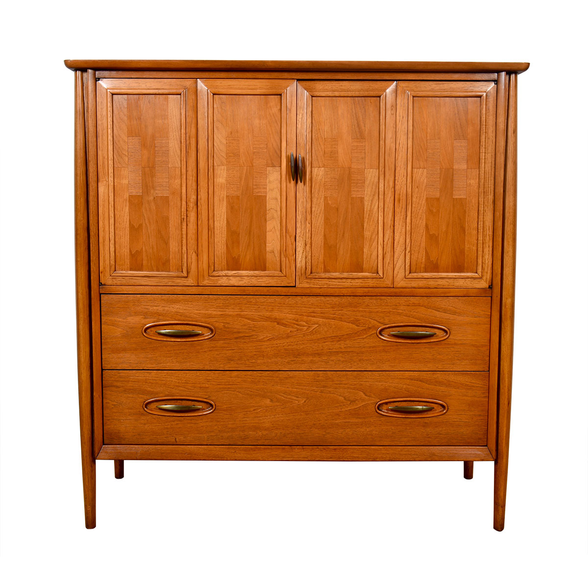 - On top, four panels with inlay comprise two bi-fold doors that open to reveal three drawers