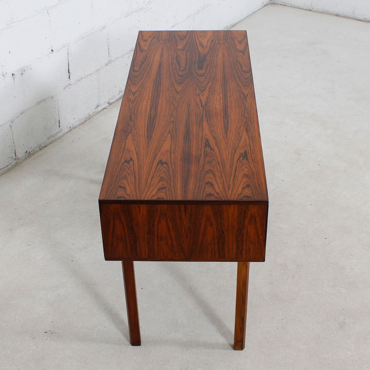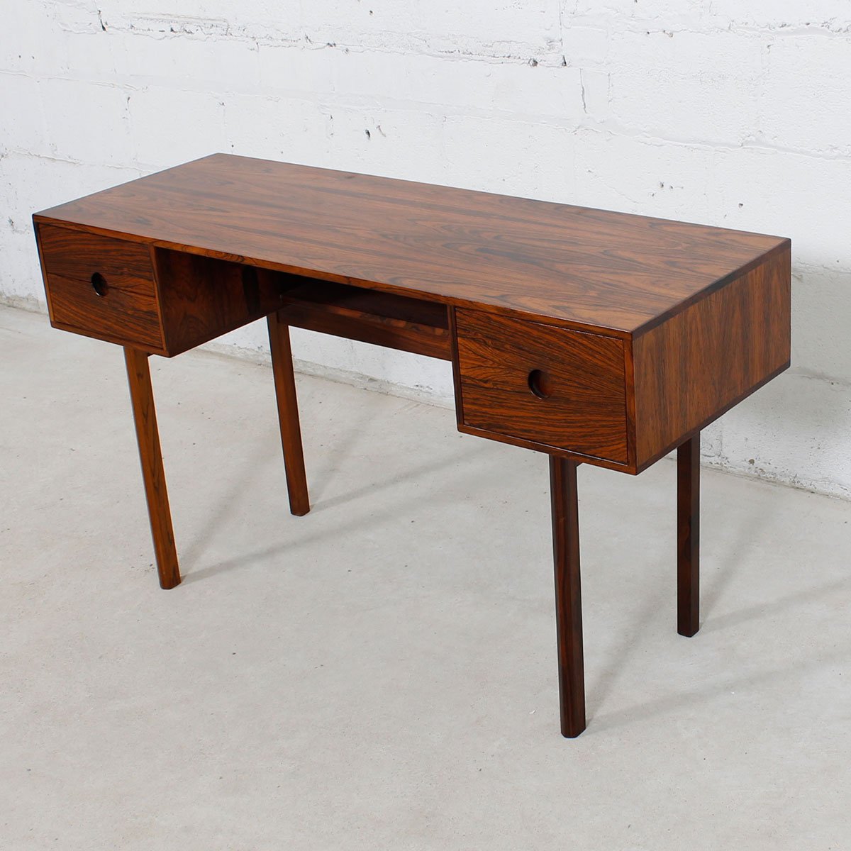 Two drawers on the left and one on the right flank the kneehole of this petite Danish Modern writing desk. The pulls are circular hollows. The rosewood has aged to a beautiful patina.