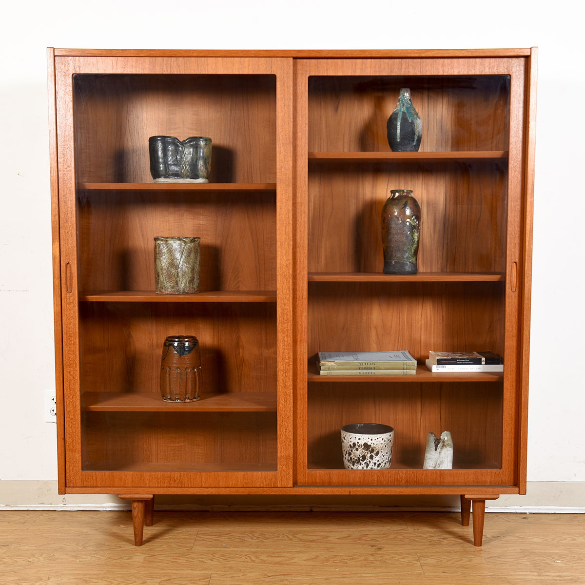 Teak Bookcase w: Sliding Glass Doors + Adj Teak Shelves