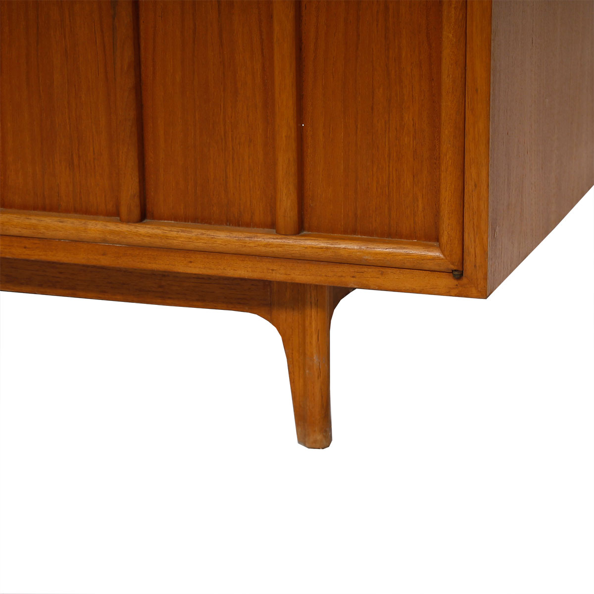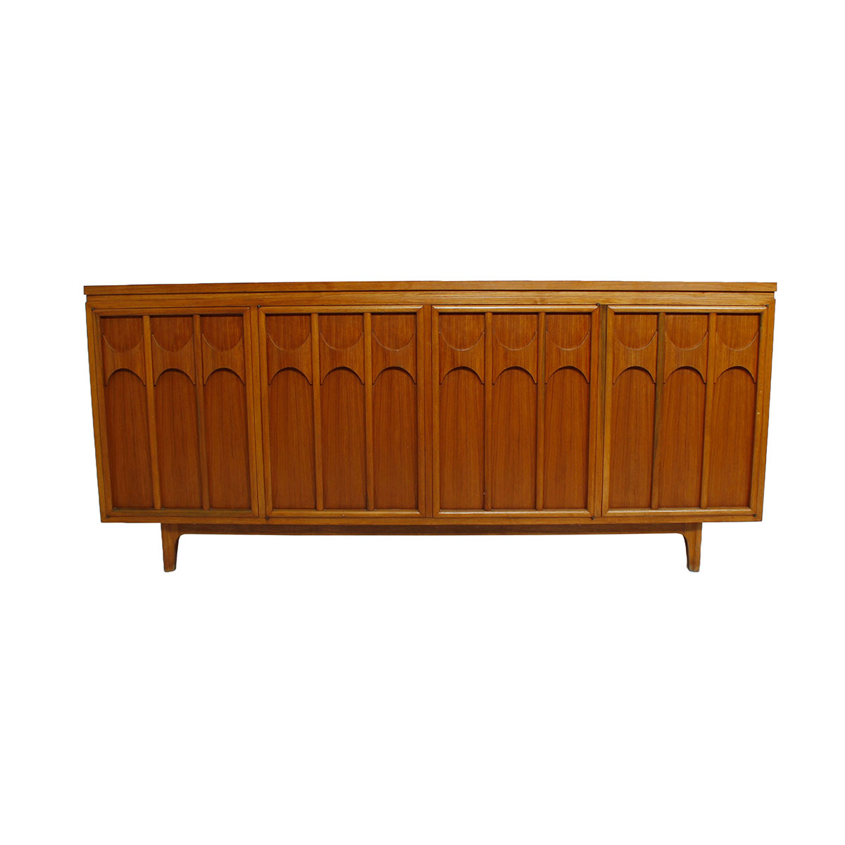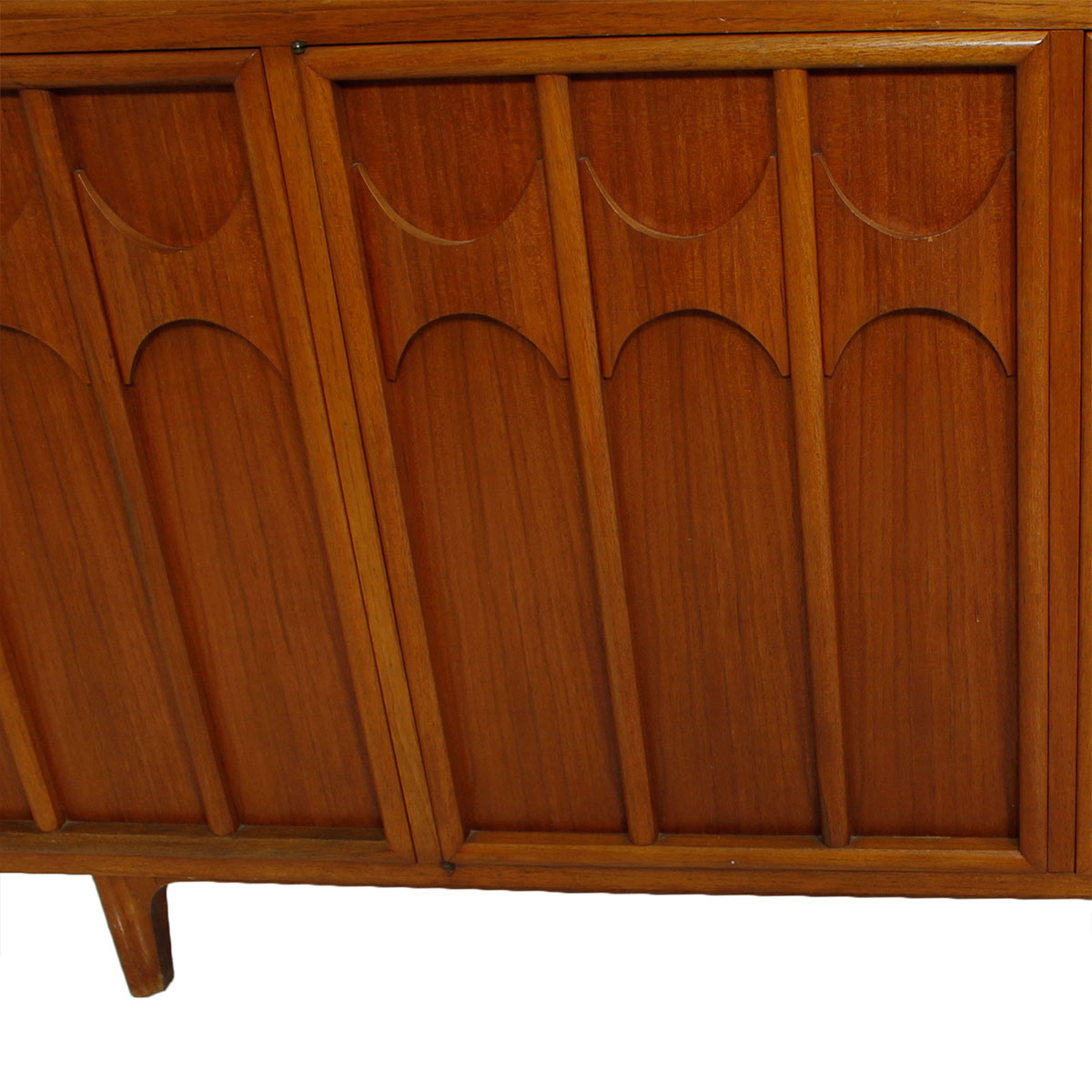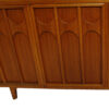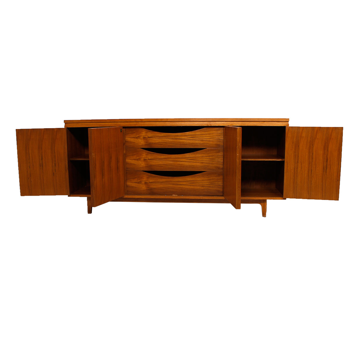 Very Attractive Mid-Century Modern piece that could easily function as a sideboard, credenza or dresser. Arch extrusions adorn the top of the doors repeating across the face, very similar to the Kent Coffey Perspecta line, and the arching Basilia line from Broyhill. Constructed in teak It offers considerable storage- the middle doors open to reveal three large roomy drawers and behind the doors on each end is an adjustable shelf.