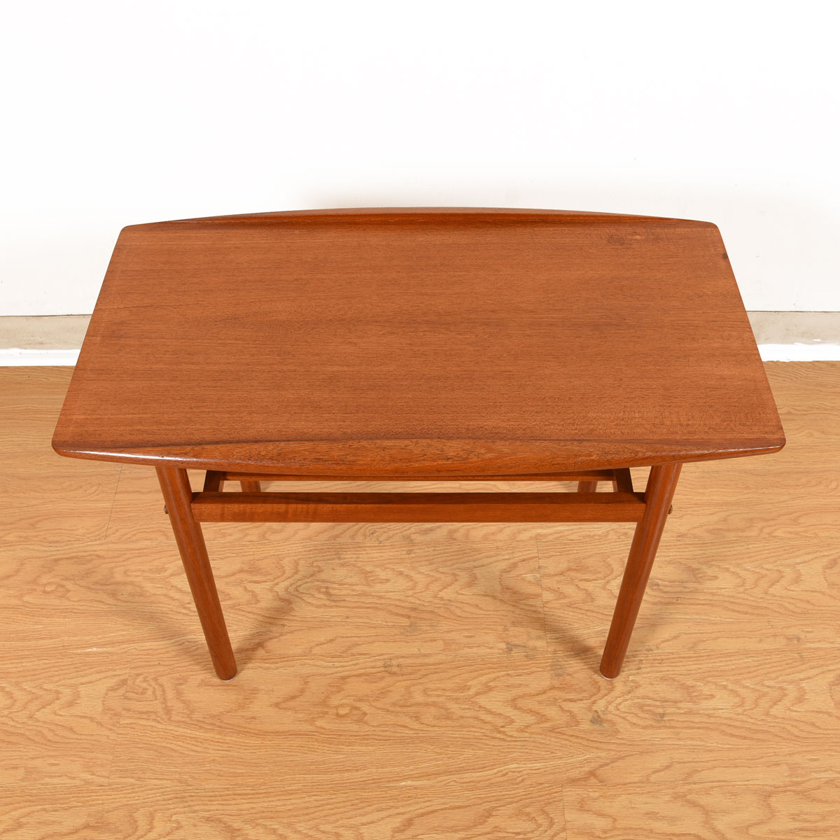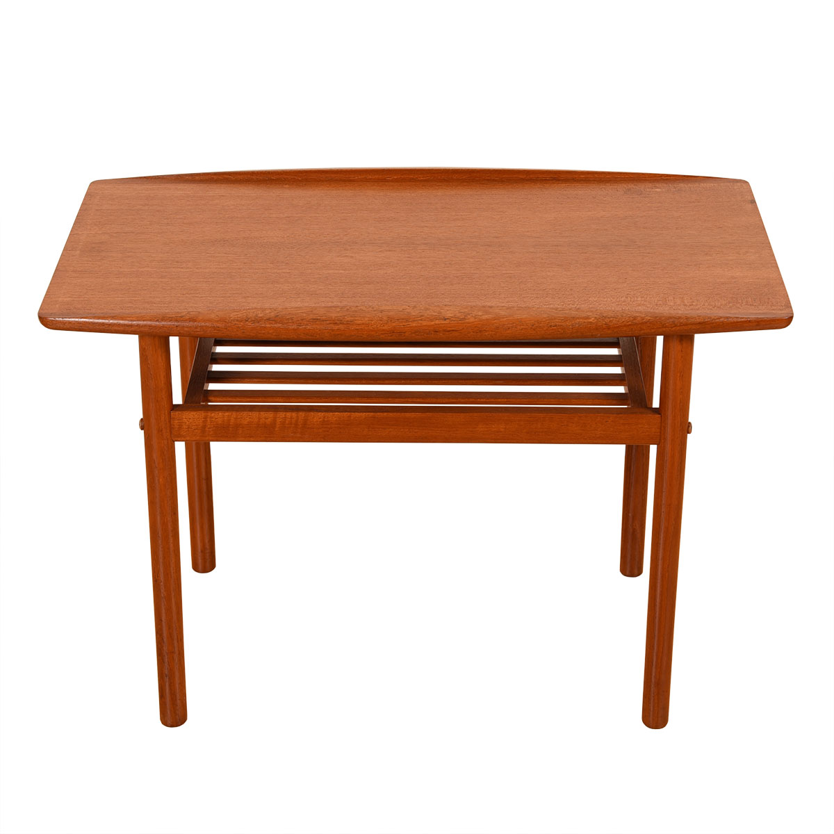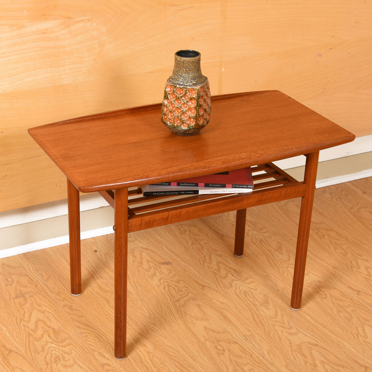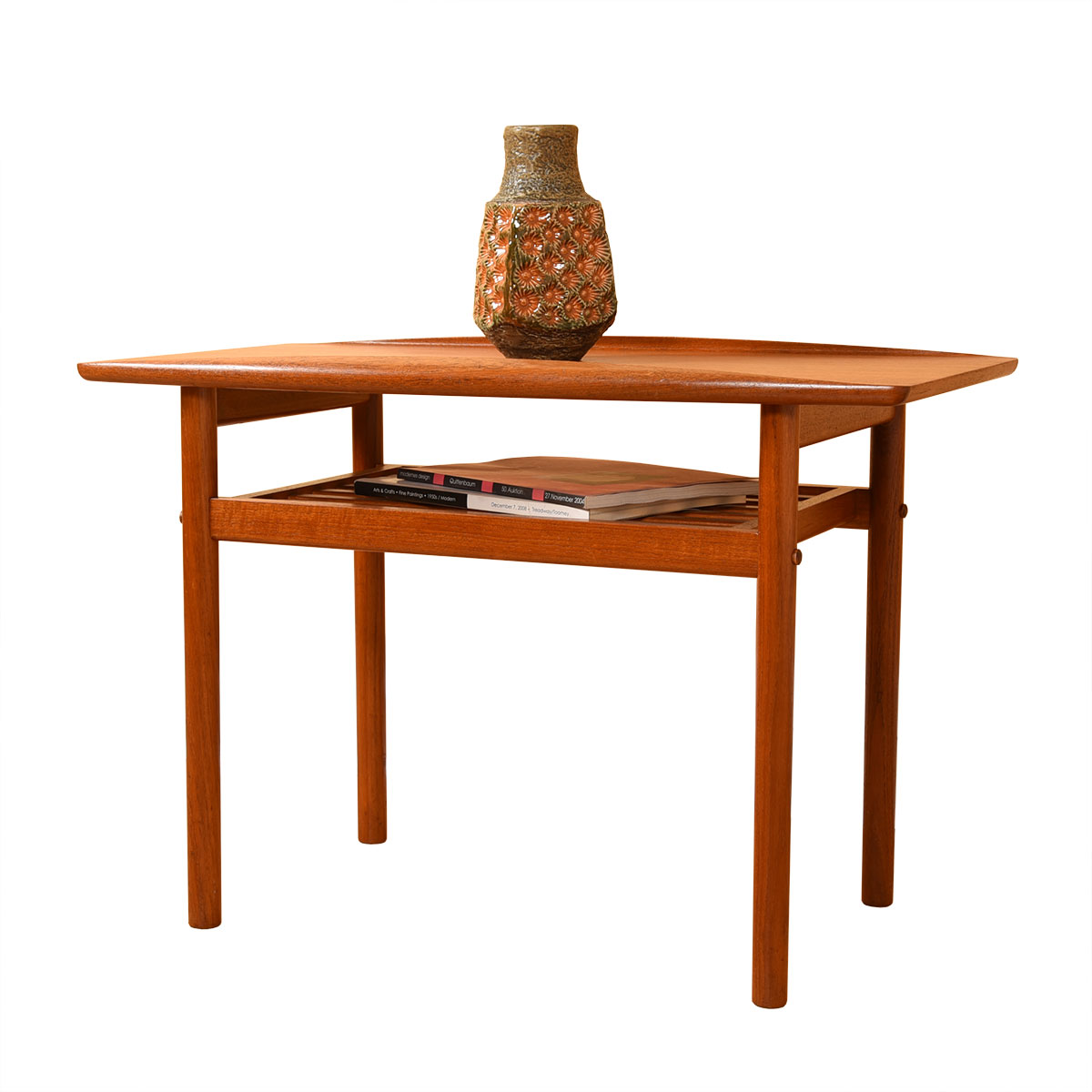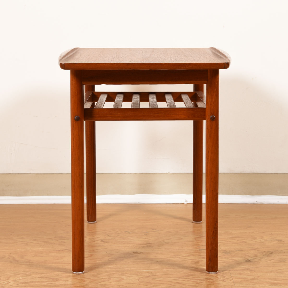 A wonderful Danish Modern end/accent table detailed with raised lip edges on the long sides. Additional functionality provided by a slat shelf below.