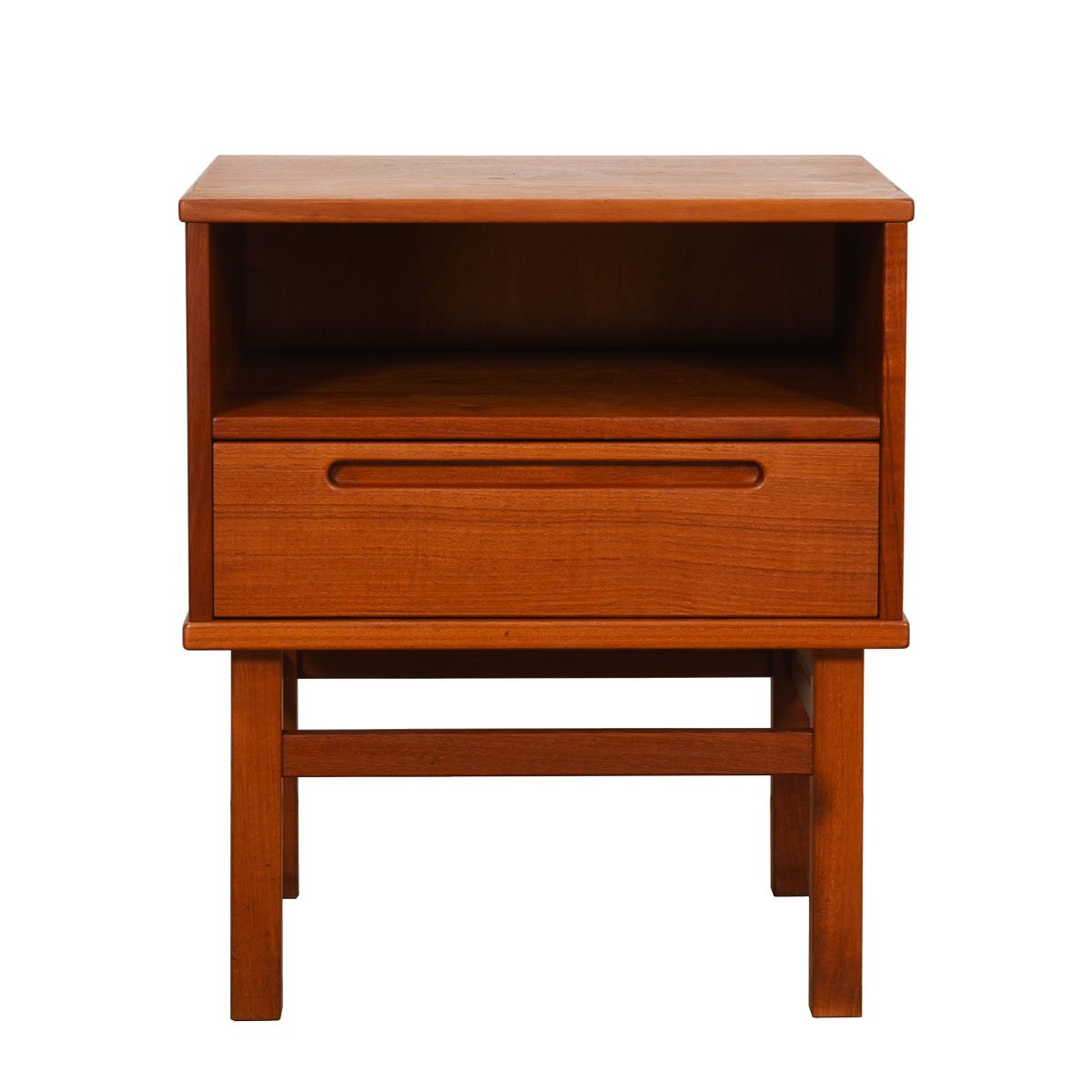 Gorgeous teak nightstand by Danish manufacturer, Torring. The case of the piece sits up on squared legs. The open side of the case is divided in half, the bottom portion being a drawer with the signature Torring handle. The upper half is open storage.