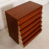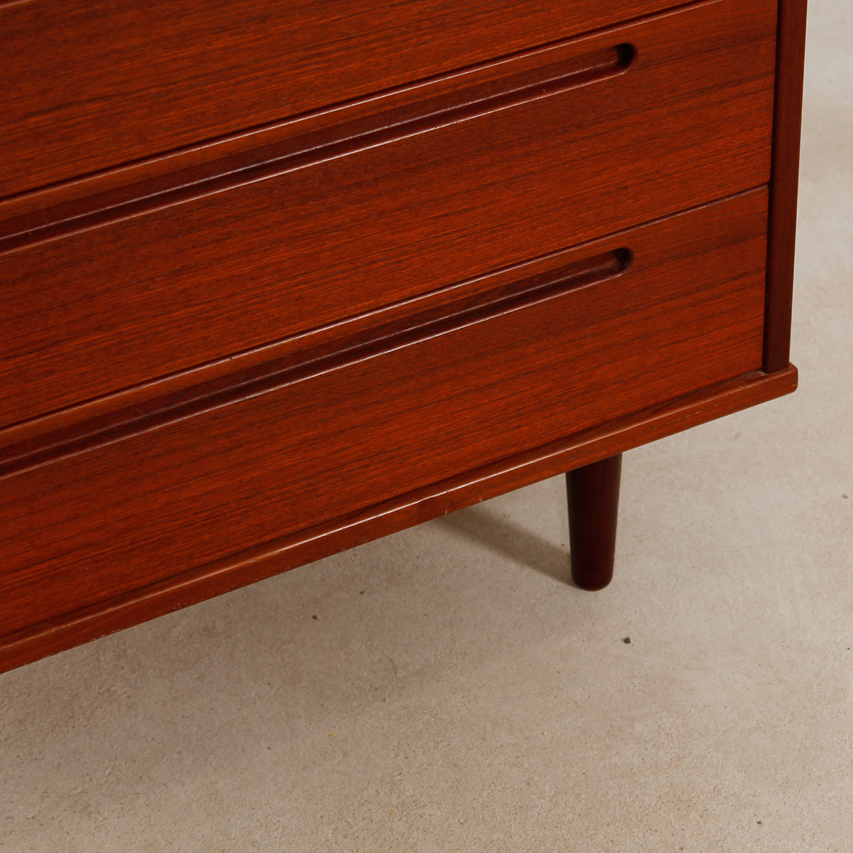 This beautiful teak dresser by Torring of Denmark has a minimalist design allowing the beauty of the wood to shine. Over time, this piece has aged to a deep, rich patina. Vertically-oriented, it has six drawers, each having a long inverted pull across the top. It sits on turned legs.