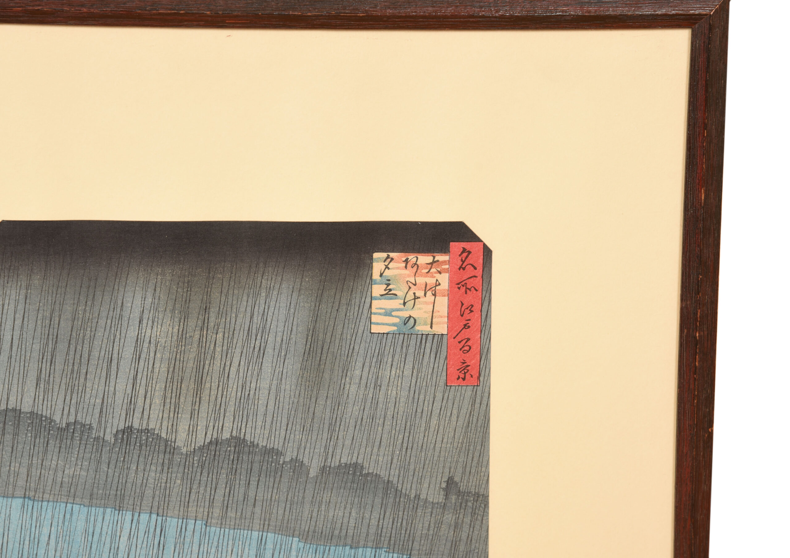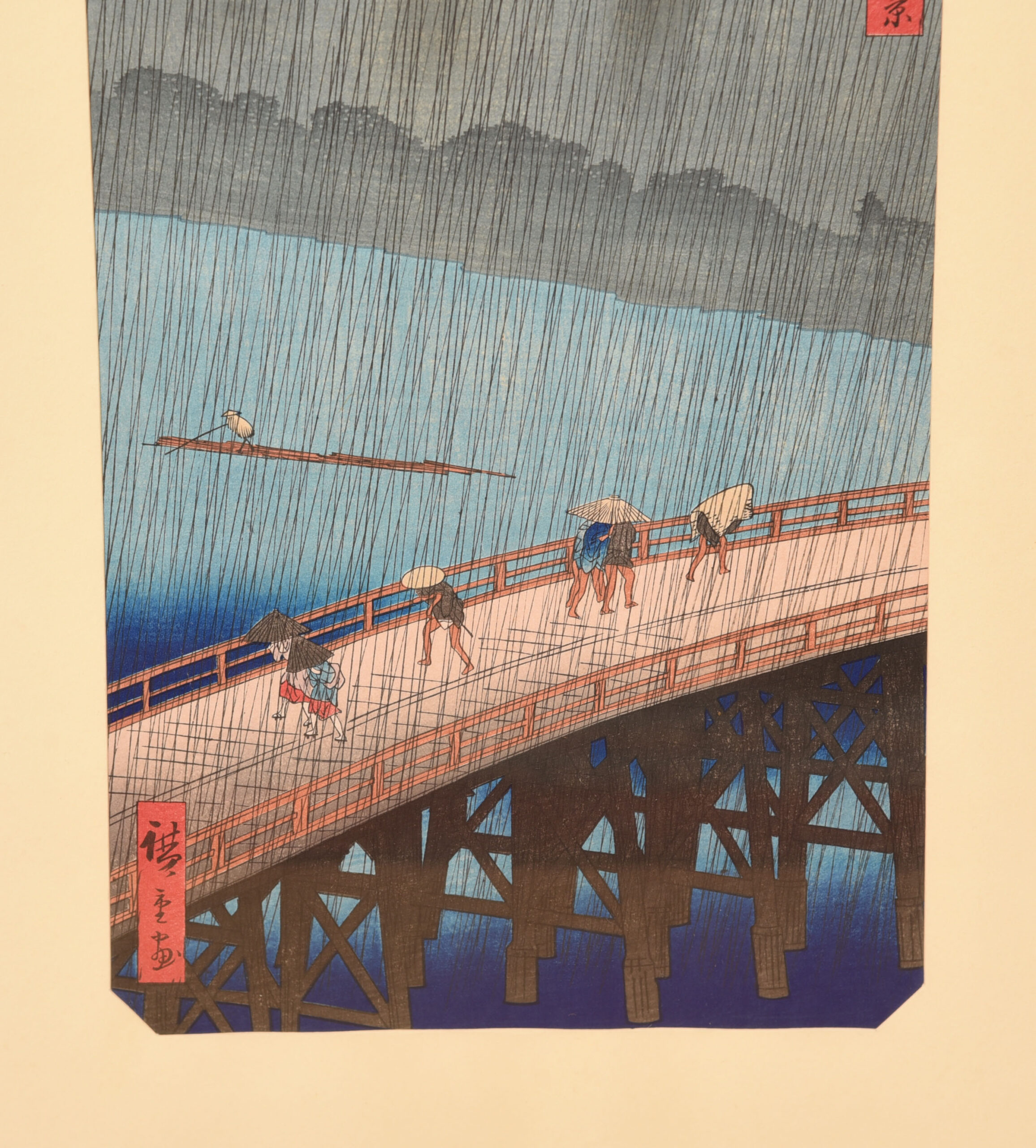 Title of the print is “Sudden Shower over Shin-Ōhashi Bridge and Atake”, from a series of prints One Hundred Views of Edo by Utagawa Hiroshige.