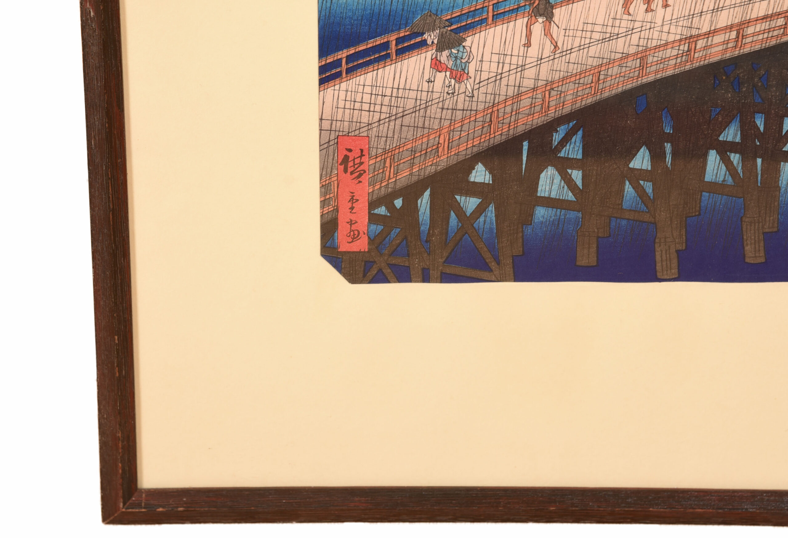 Traditional Japanese Ukiyo-e Woodblock Print of People Crossing a Bridge on a Rainy Day