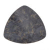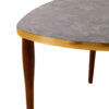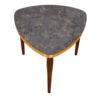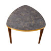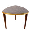 Triangular-shaped accent table with a blue, gray & gold formica top. The brass trim around the edge and dark, curvy legs really set it apart from the average.