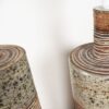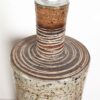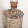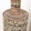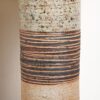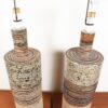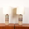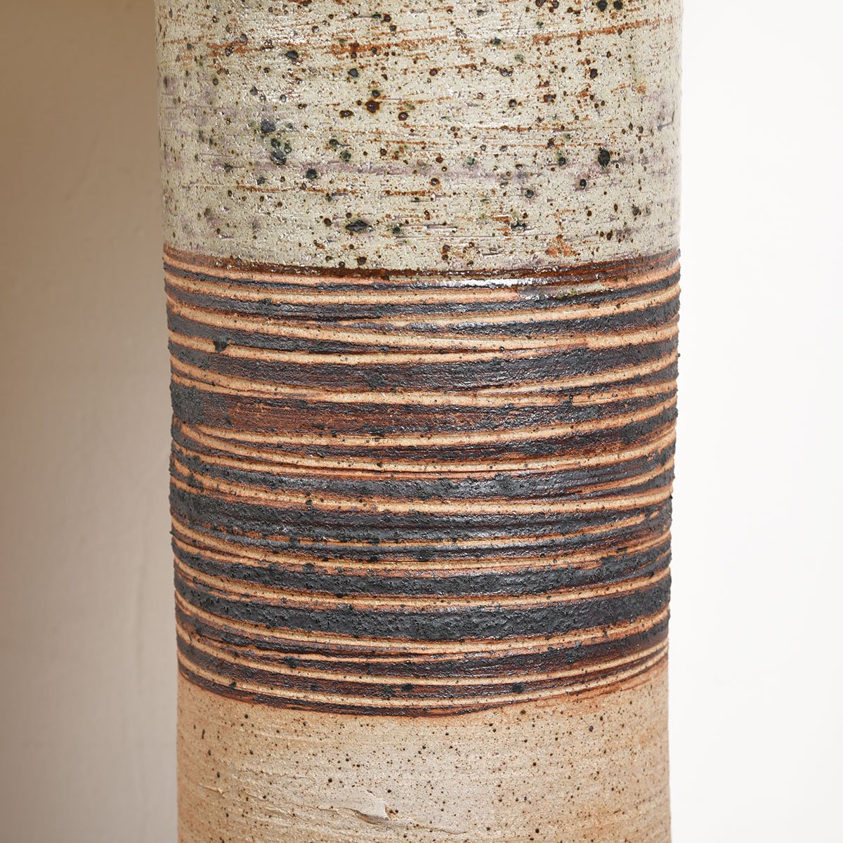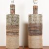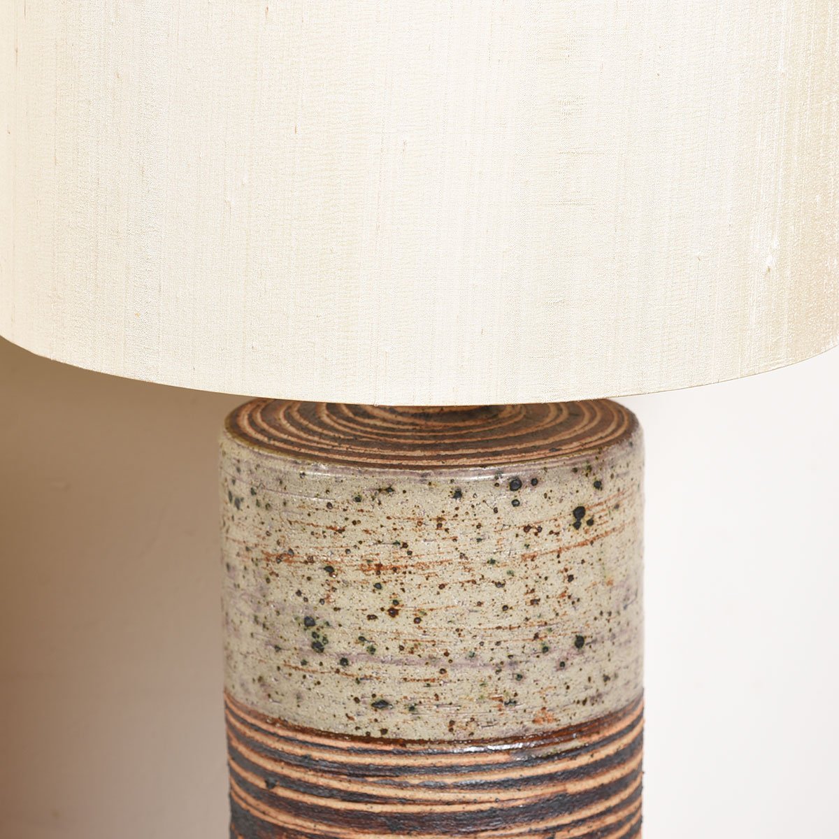 This stunning pair of pottery lamps were made in Denmark. The column is visually divided into three sections by the use of different treatments — the top is speckled, the middle has striping, and the bottom is a natural color. The range of natural colors includes gray, brown, and eggshell.