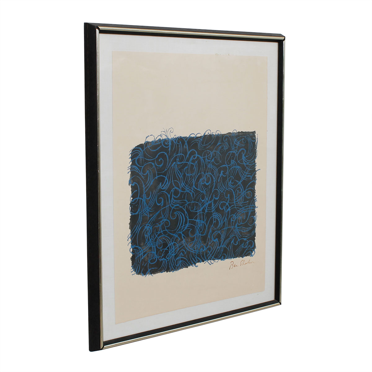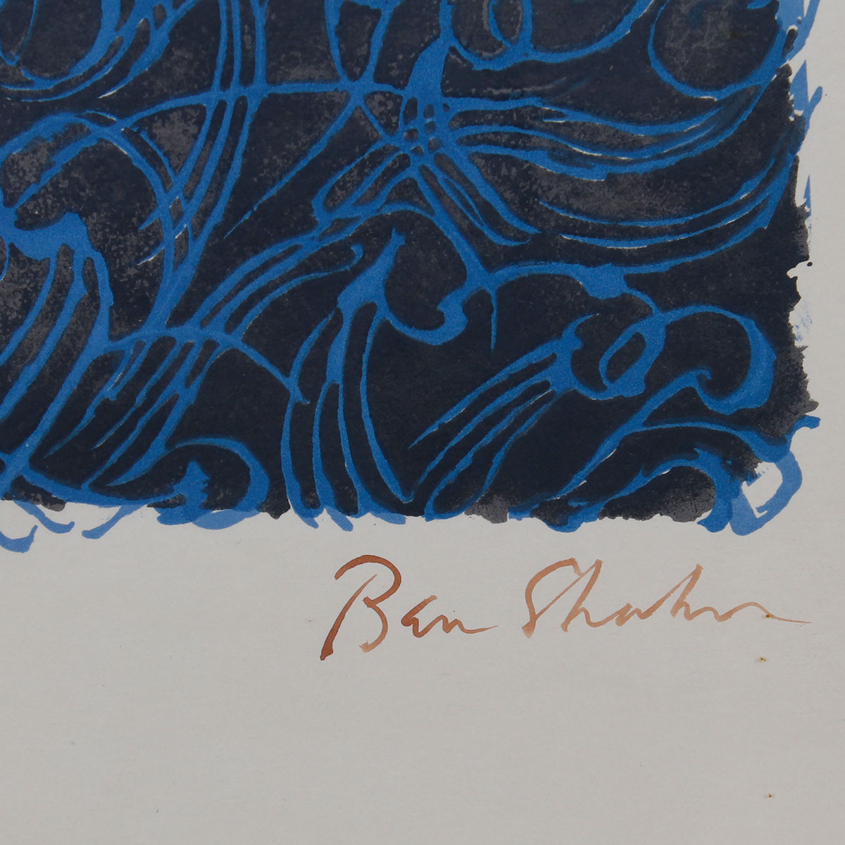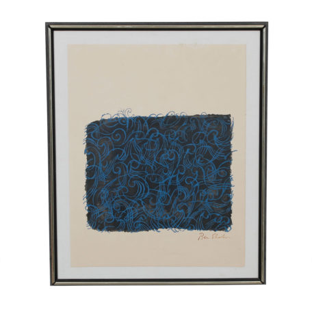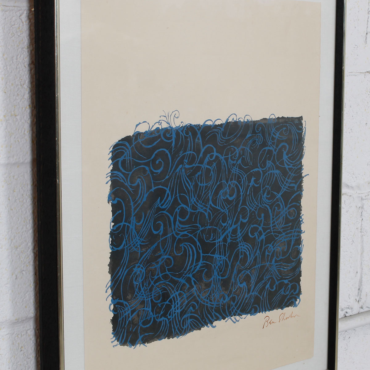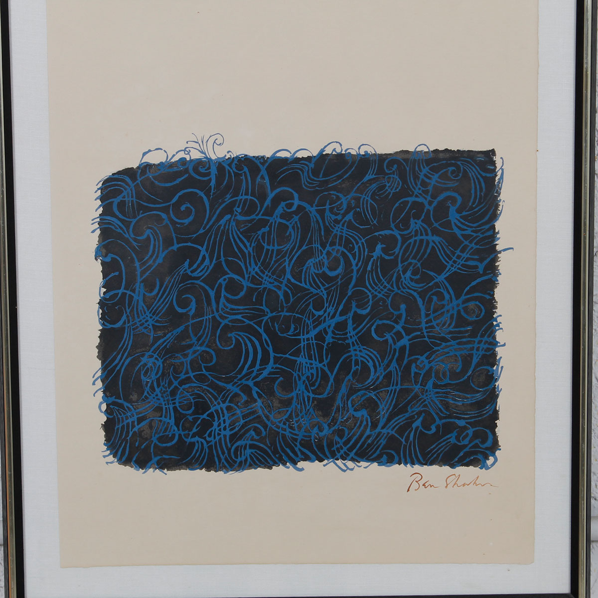 From the renowned artist Ben Shahn comes this fascinating piece. An irregular black patch taking up 2/3 of the space is done over with blue squiggles.