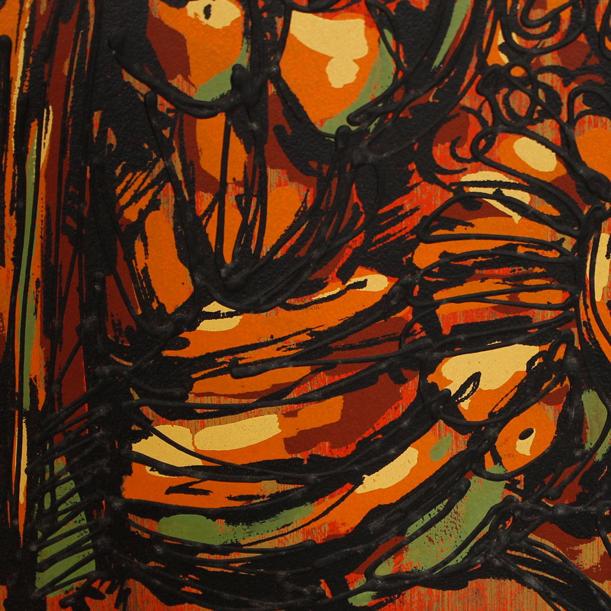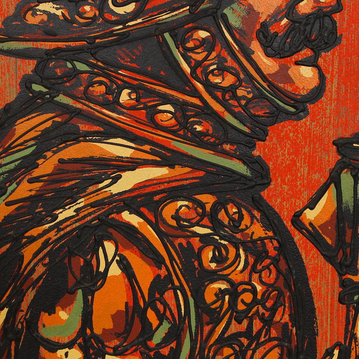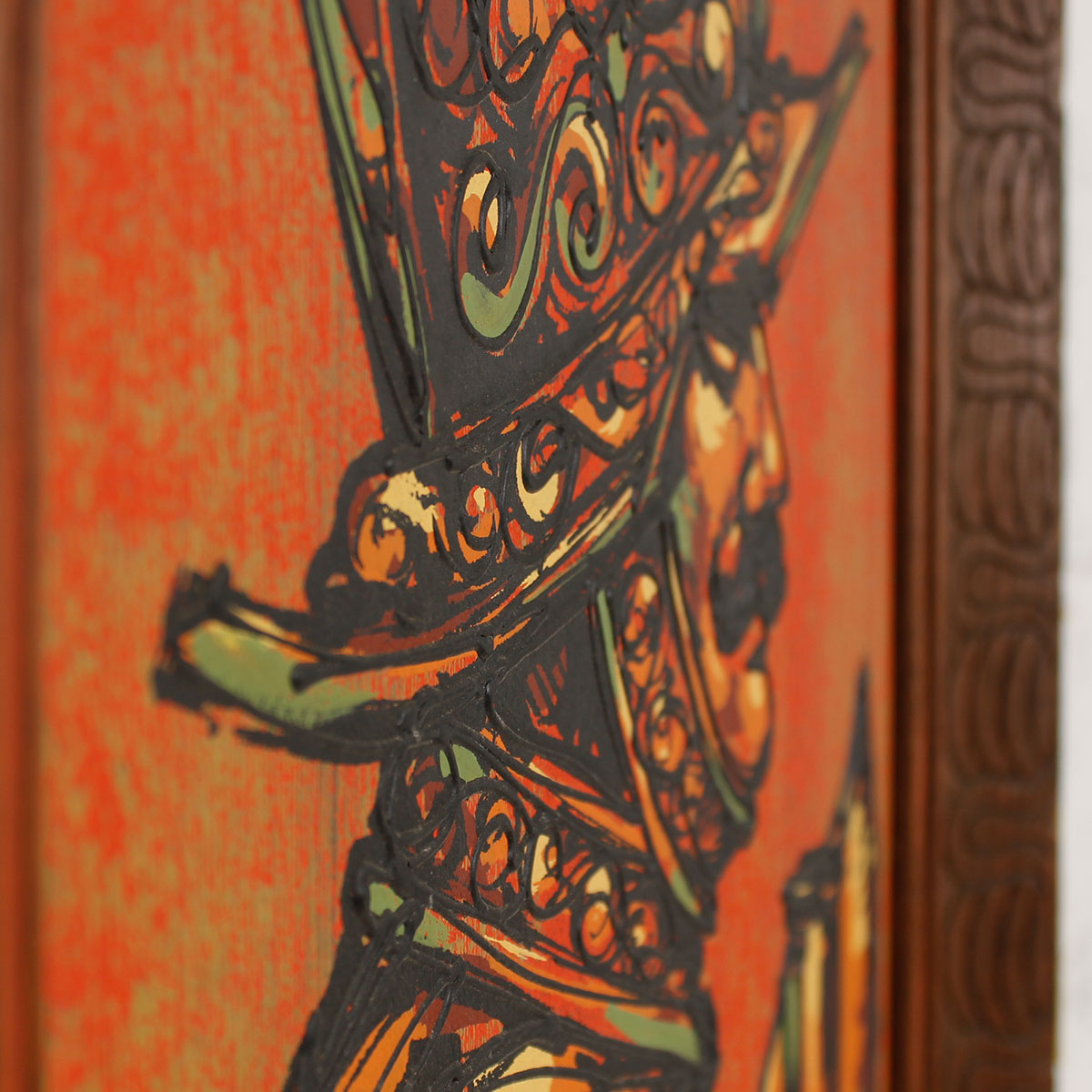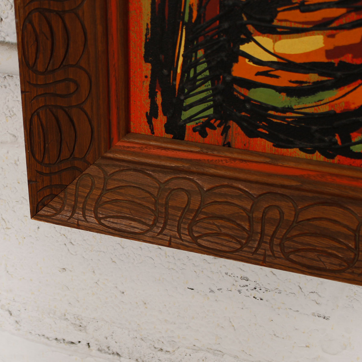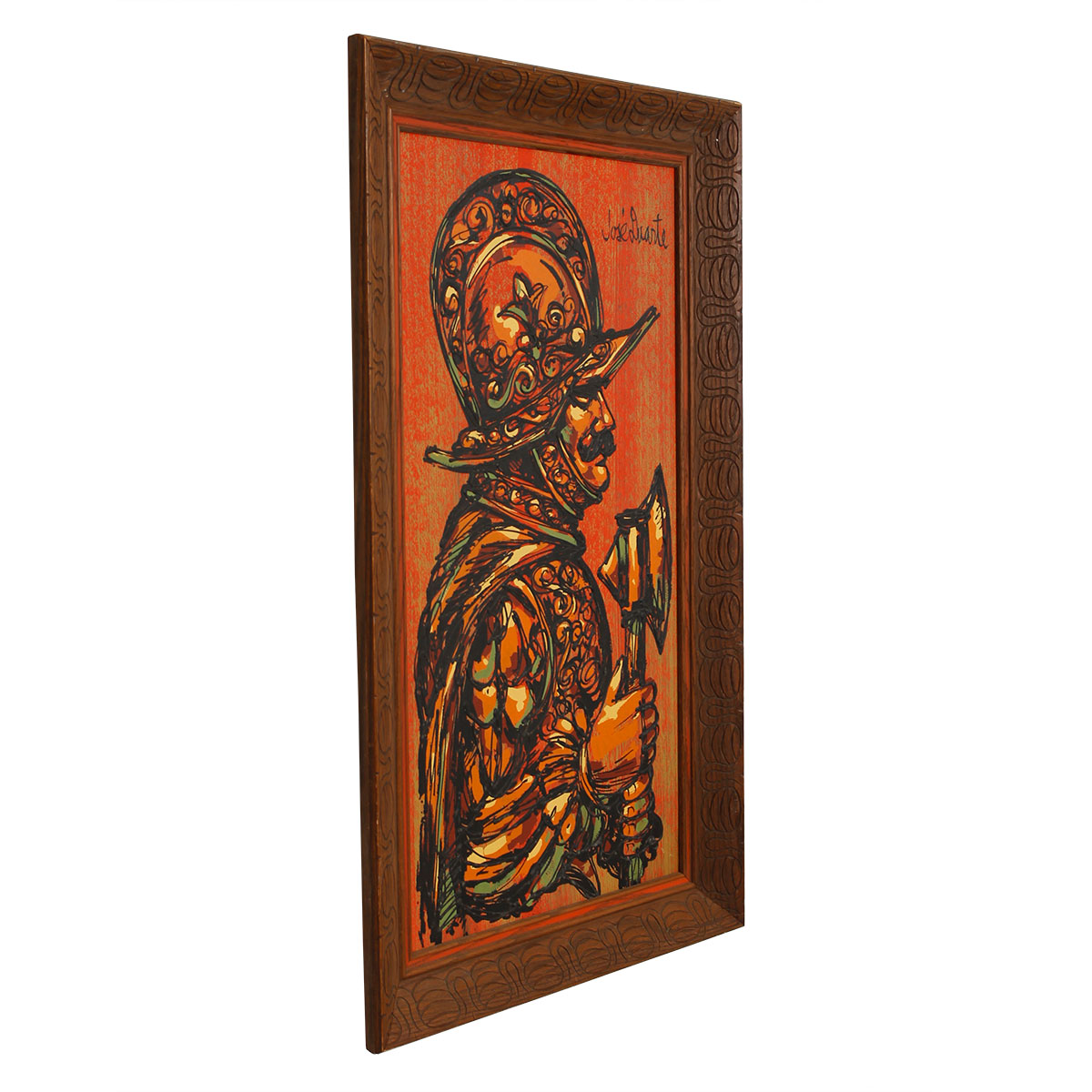 A very MCM depiction of a Spanish conquistador redered in warm tones of orange, red & yellow with black. Nice MCM frame, too.
