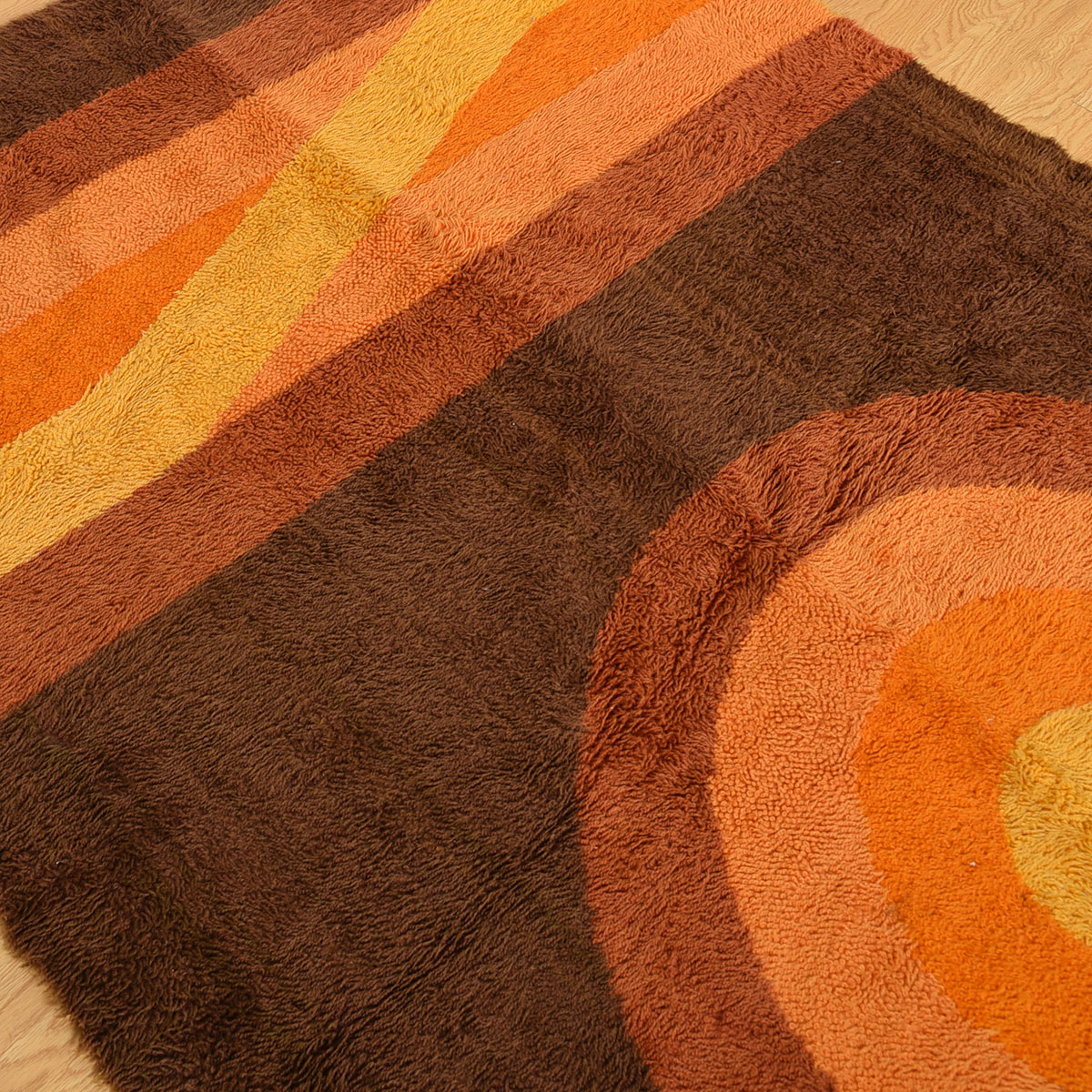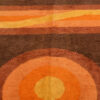 A classic, MCM motif of the desert sun hovering above the horizon line is captured on this wonderful MCM rug. Background is brown with shades of rust, orange and yellow. 70s fun!