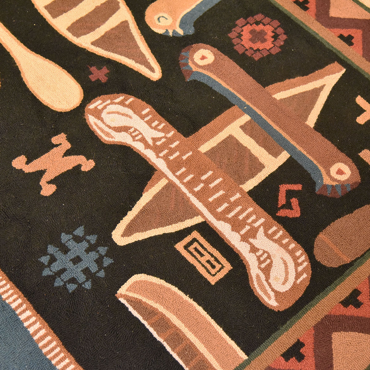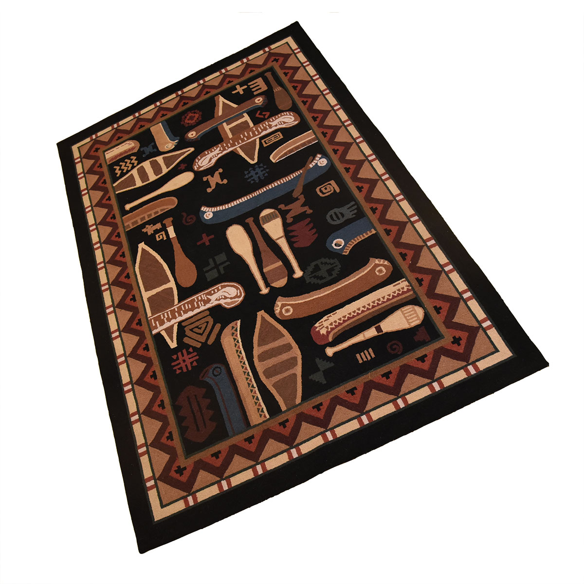 Stylized kayaks, canoes and paddles form the design on this vintage floor covering. Colors are black, brown, tan, and marine blue.