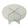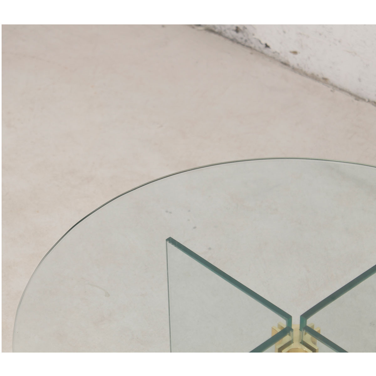 A smaller glass and brass accent table attributed to Leon Rosen for the famous Pace Collection, New York. The base is a glass “X” with brass hinges holding the pieces together — just a touch of gold gleaming through the glass. Nicely sized for tighter spaces and of course the glass makes the table “disappear” into your room. Very stylish!