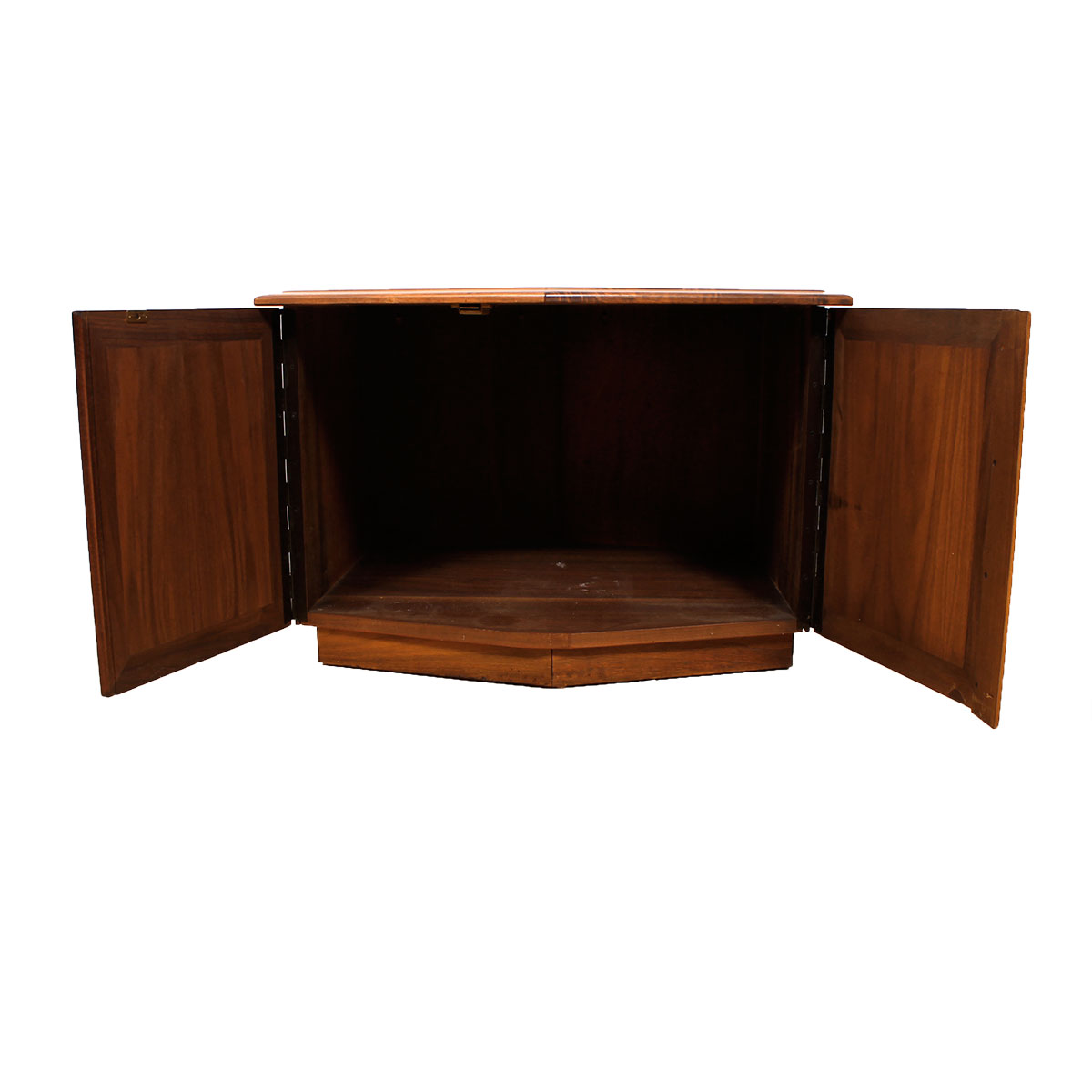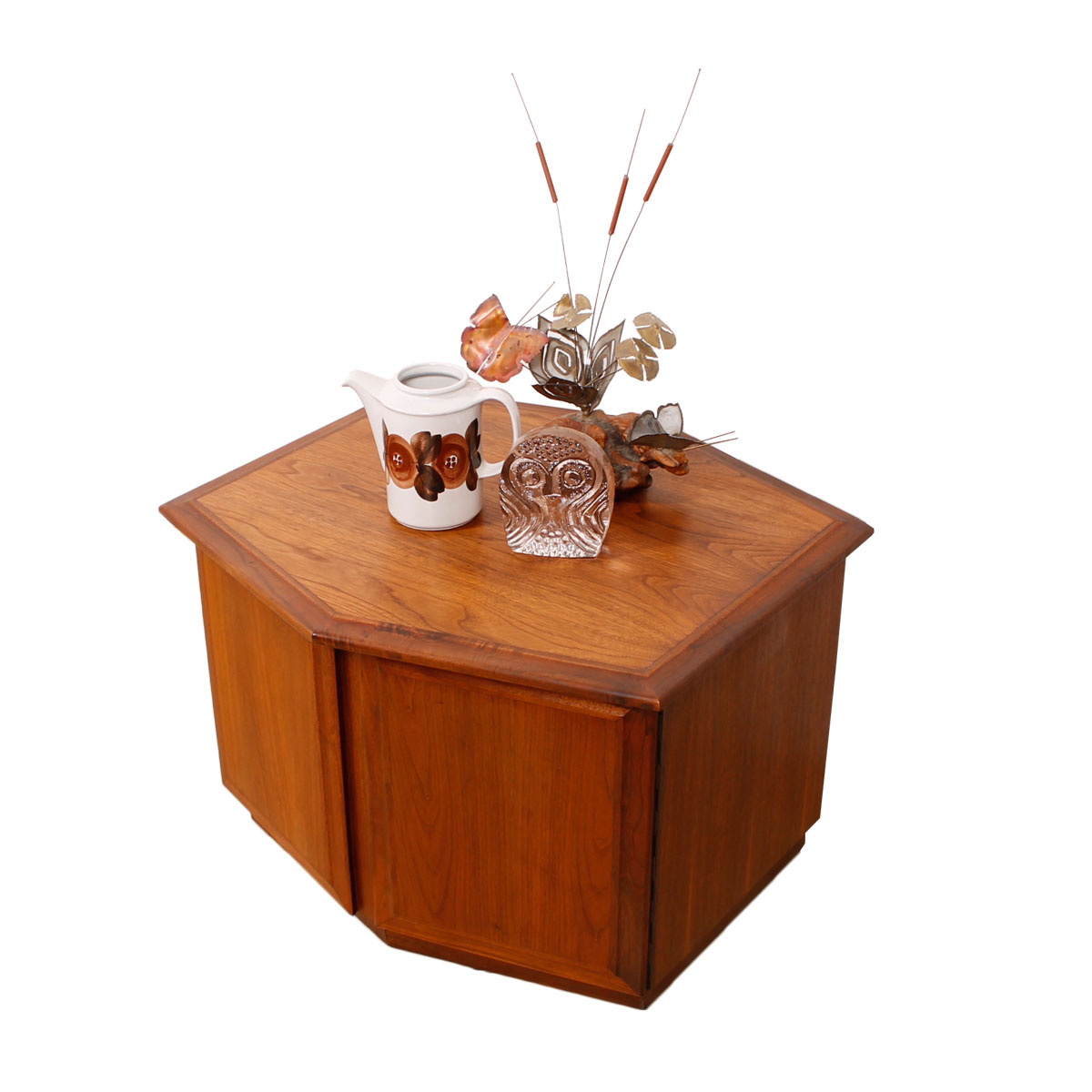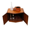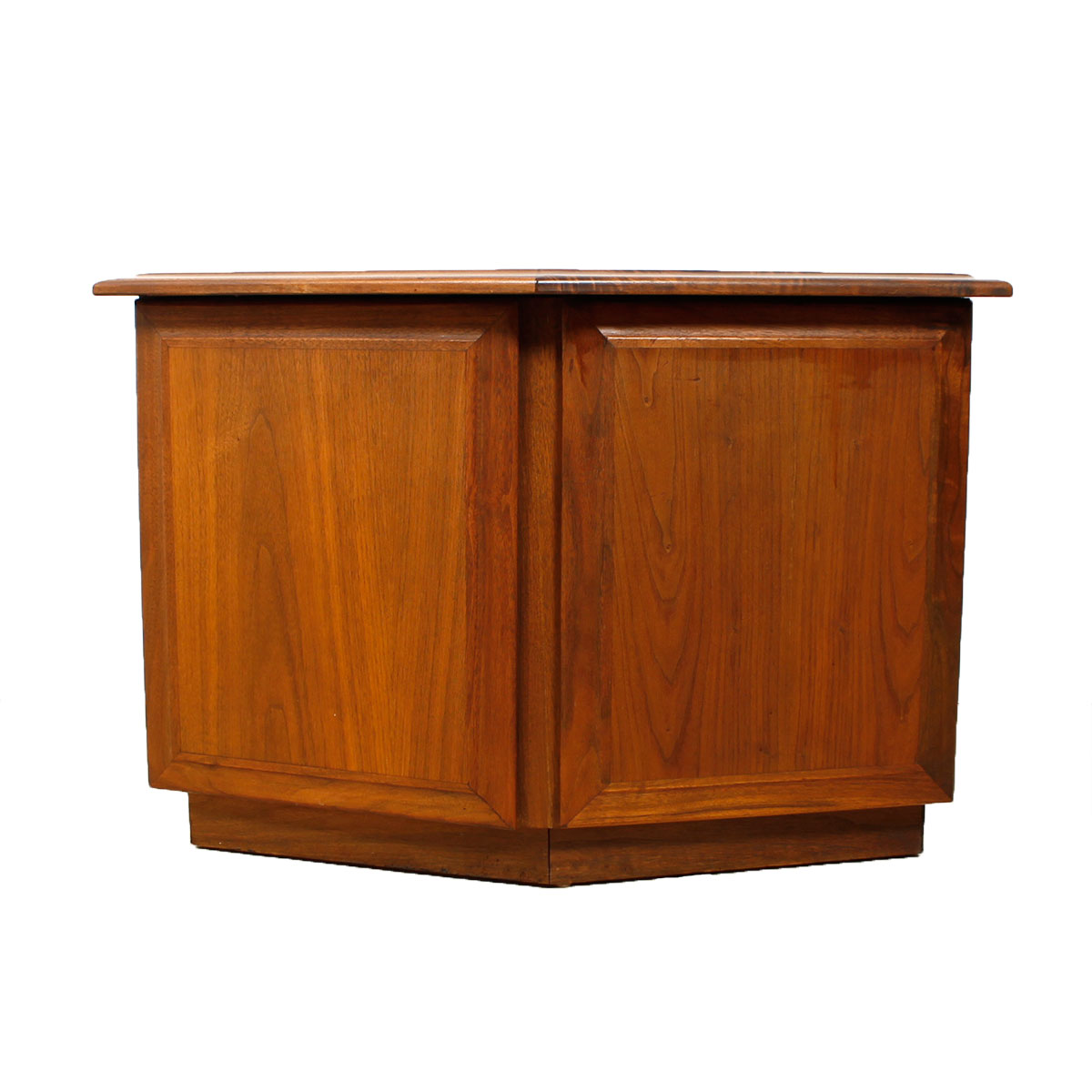 Versatile piece in walnut that can serve as an end table, nightstand or bar cabinet – or any combination thereof! Its six-sided top makes takes the end table with closed storage to a new level.