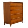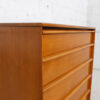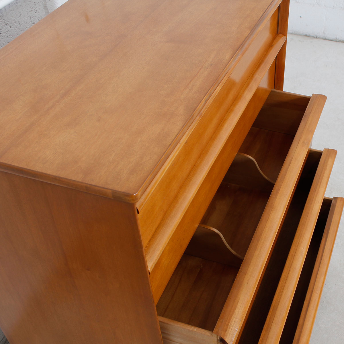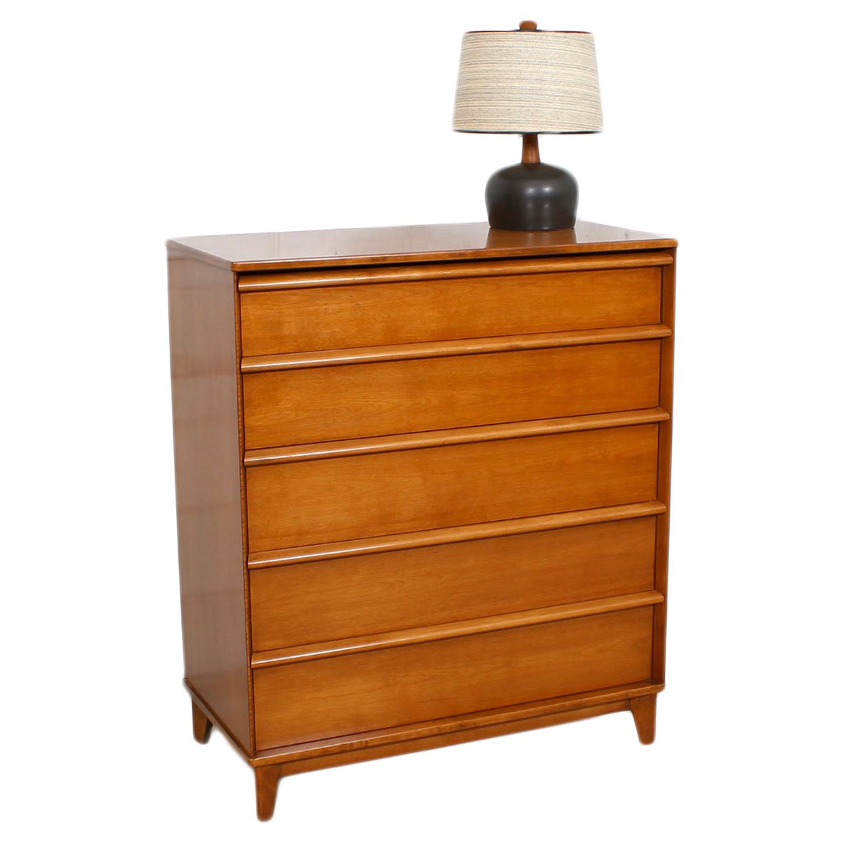 Here to get the job done is this sturdy tall dresser dating to the 1950s. It features five deep drawers (some sectioned), each having a sculpted pull across its top. The case sits upon a base with angled legs, bowed under the weight of the dresser – a humorous touch acknowledging the piece’s solid construction.