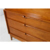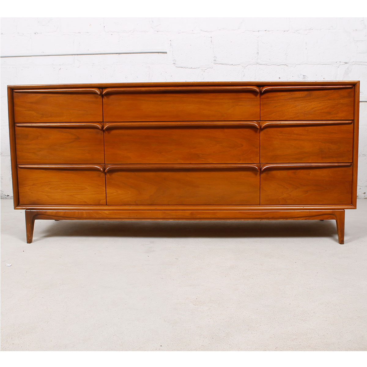 This Mid century modern walnut dresser provides an impressive amount of storage in distinctive style. The piece has deep drawers fronted with very unusual sculptural handles. The upper two drawers have a long continuous pull with a slight downward curve at each end, while the lower three, slightly deeper, are “V’d” in the middle in a very sensual manner. It sits on a frame with slightly splayed legs further giving lightness and movement to the overall design of the piece. The walnut is a rich, warm umber.