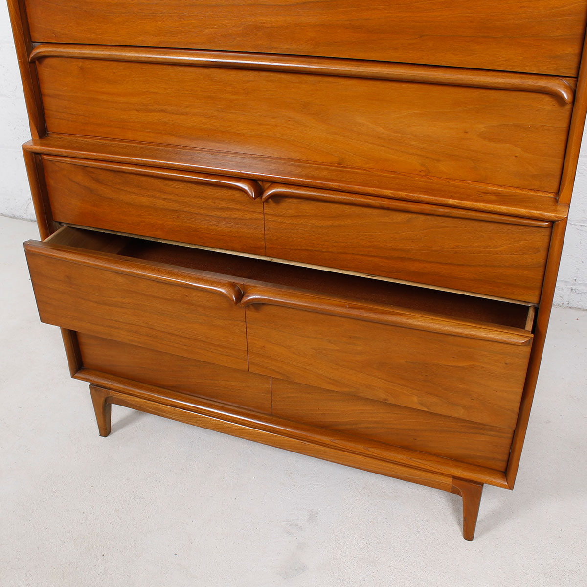 Walnut Mid Century Sculpted Pull Tall Dresser