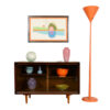 - An inverted orange triangle on a slender graduated orange pole terminates on a round base of orange to form this lamp