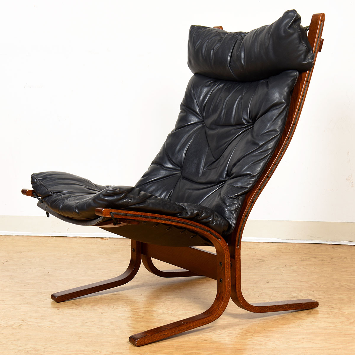 This beautiful Scandinavian design features curving rosewood frame with black leather tufted sling cushions.