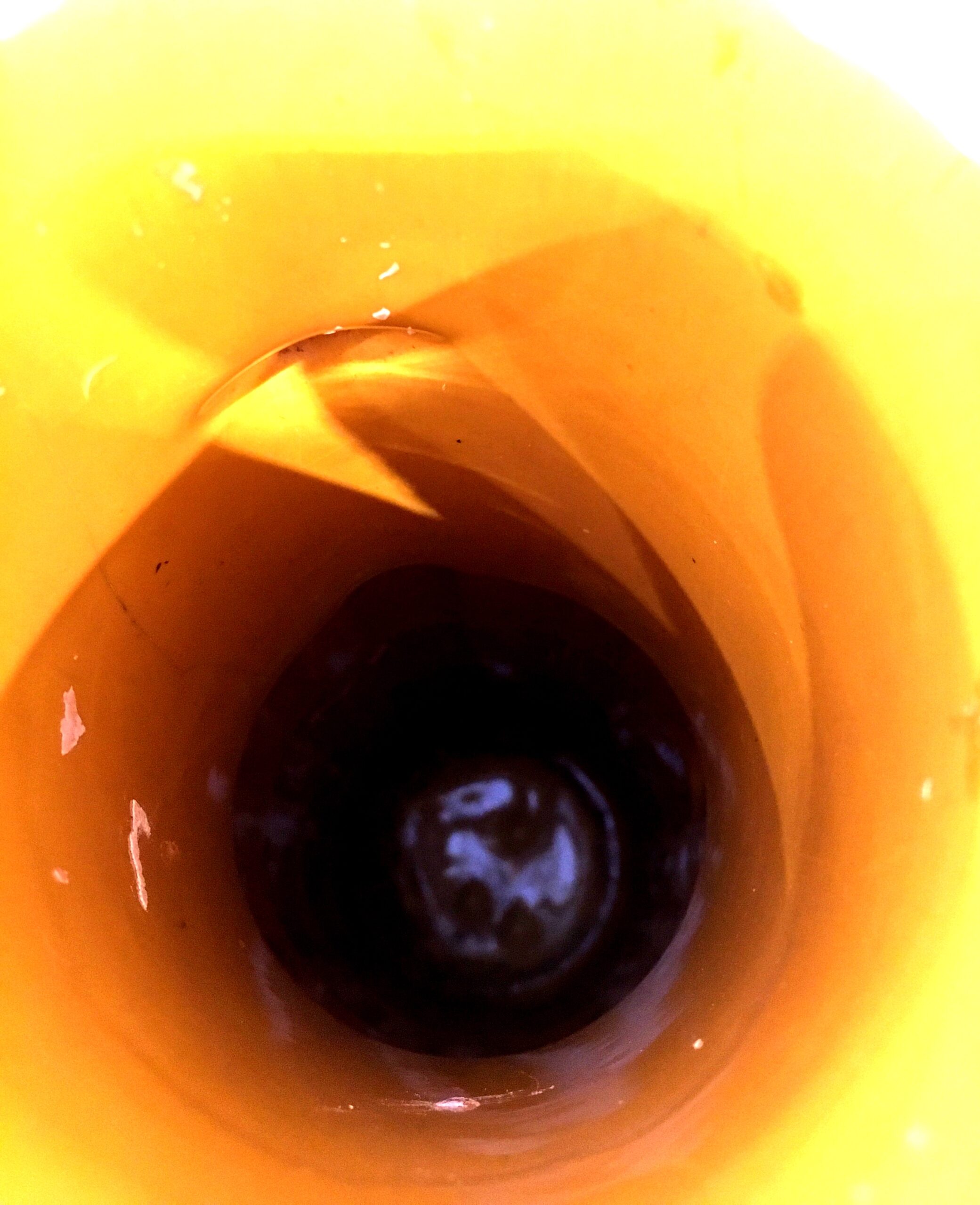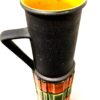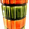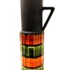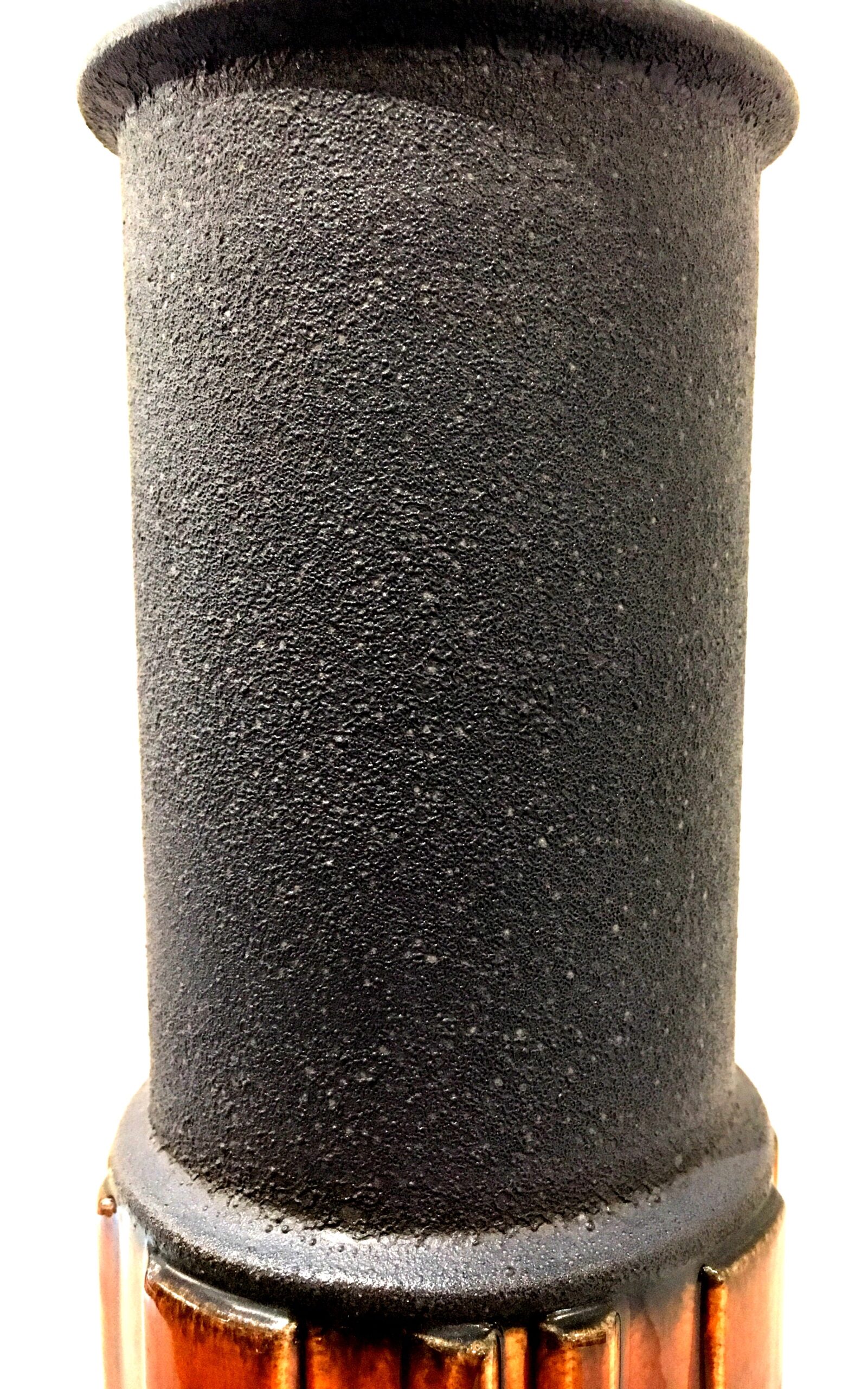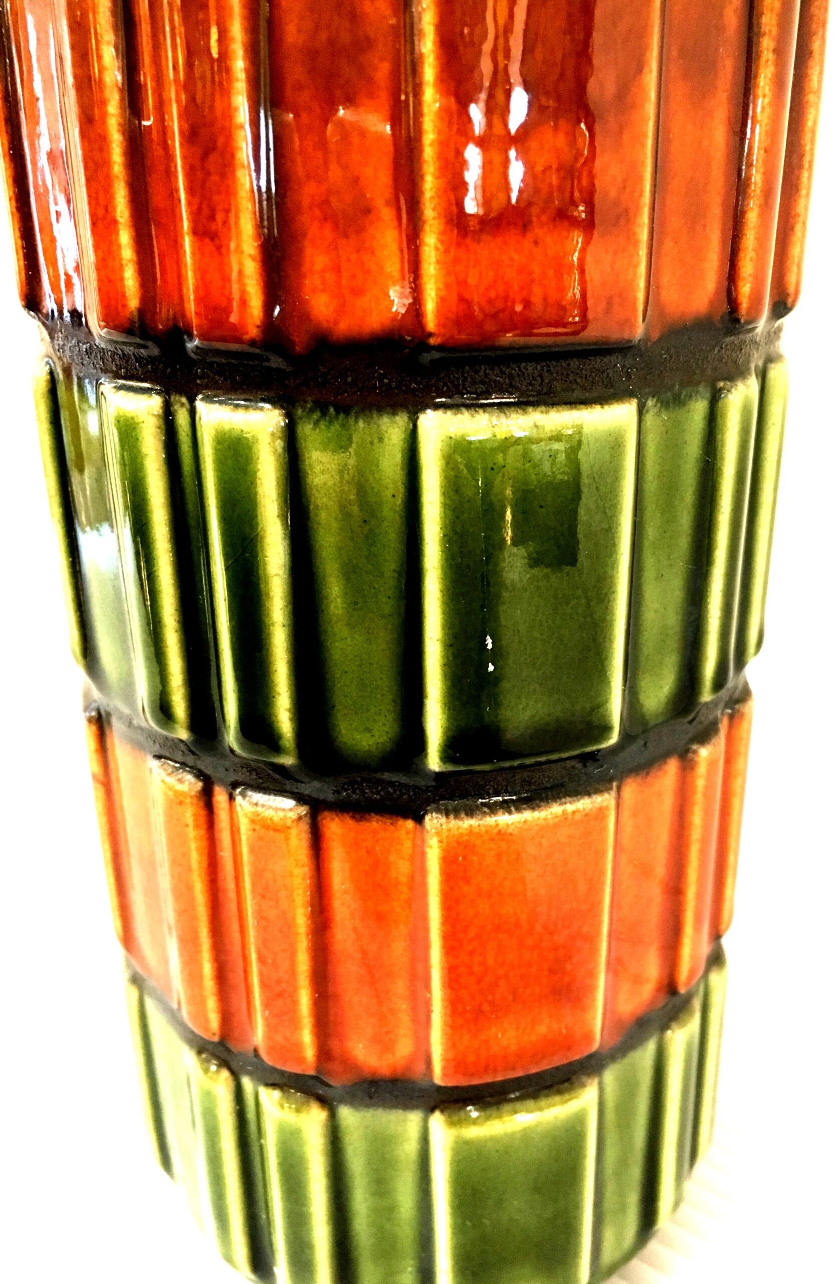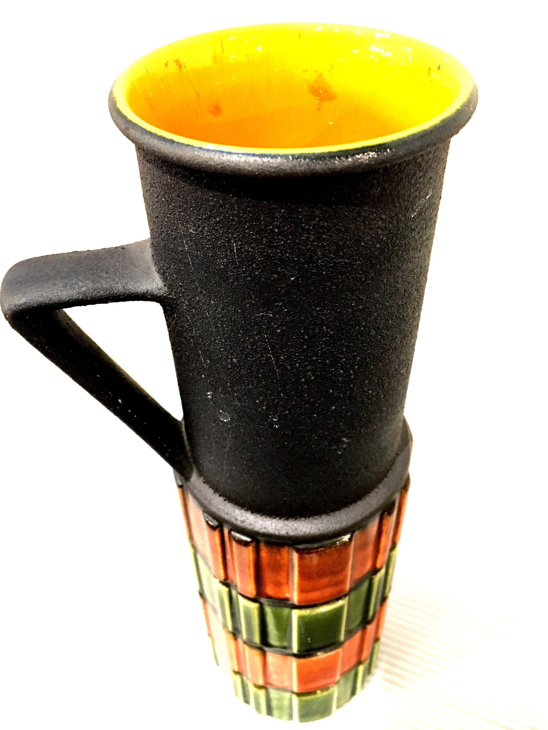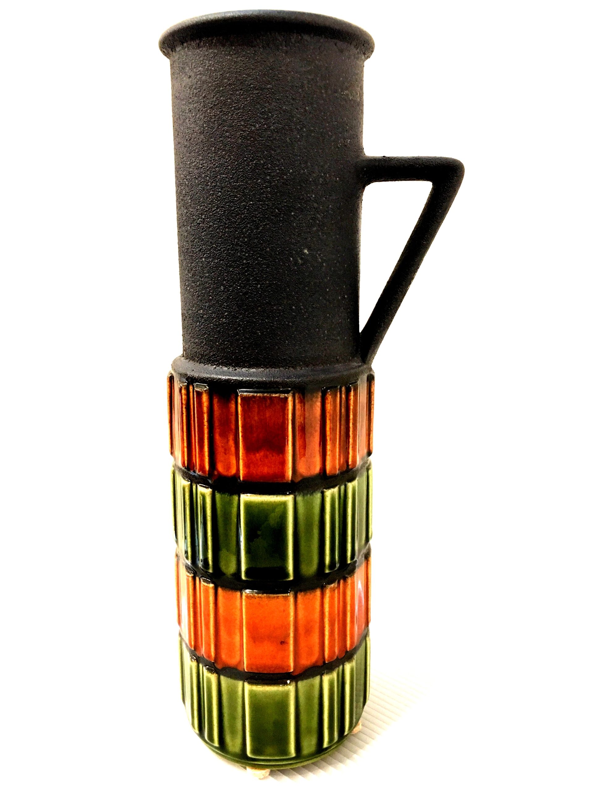 MCM West German pottery pitcher with a great form, interesting textures and varied finishes. Exterior half is black matte smooth finish; below is te tured and painted with a glossy finish, green and orange. The interior is sunflower yellow. Super décor touch!
