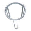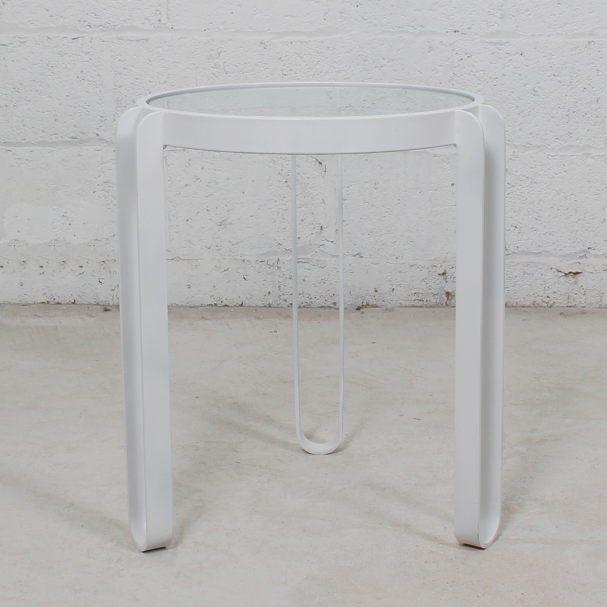 Simple and sturdy but nicely detailed cast iron side table or accent table in a circular form. The cast iron has been finished in white and the top is glass. Has three “modified hairpin” legs, and the tops of the legs where they join the frame that holds the glass insert become part of the design of the top.