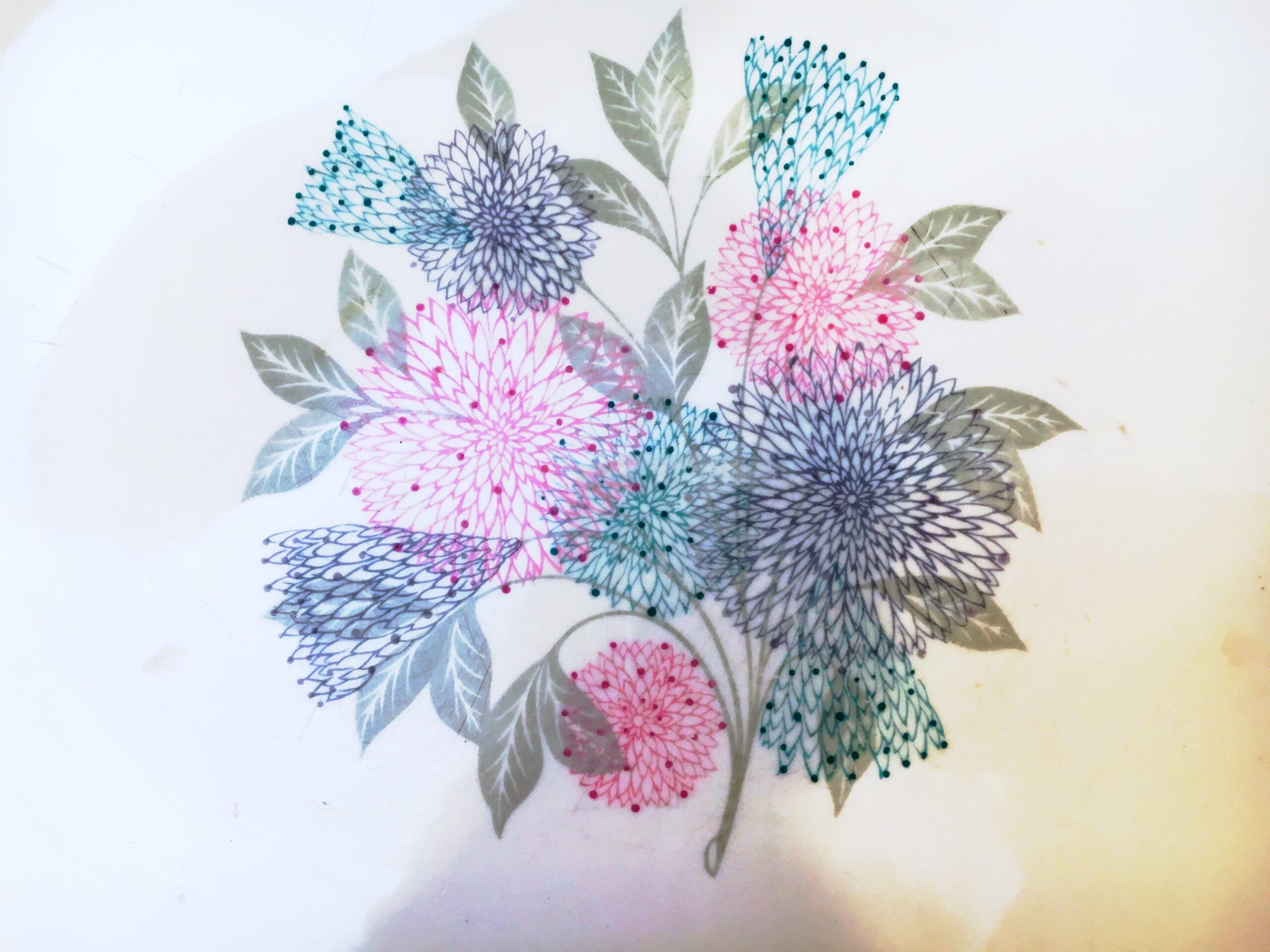 Here’s a wonderful MCM platter for your entertaining needs. Designed by Eva Zeisel, this is by Hallcraft, a division of the Hall China Company, USA. Features a stylized bouquet of flowers in blue, pink and green on white.